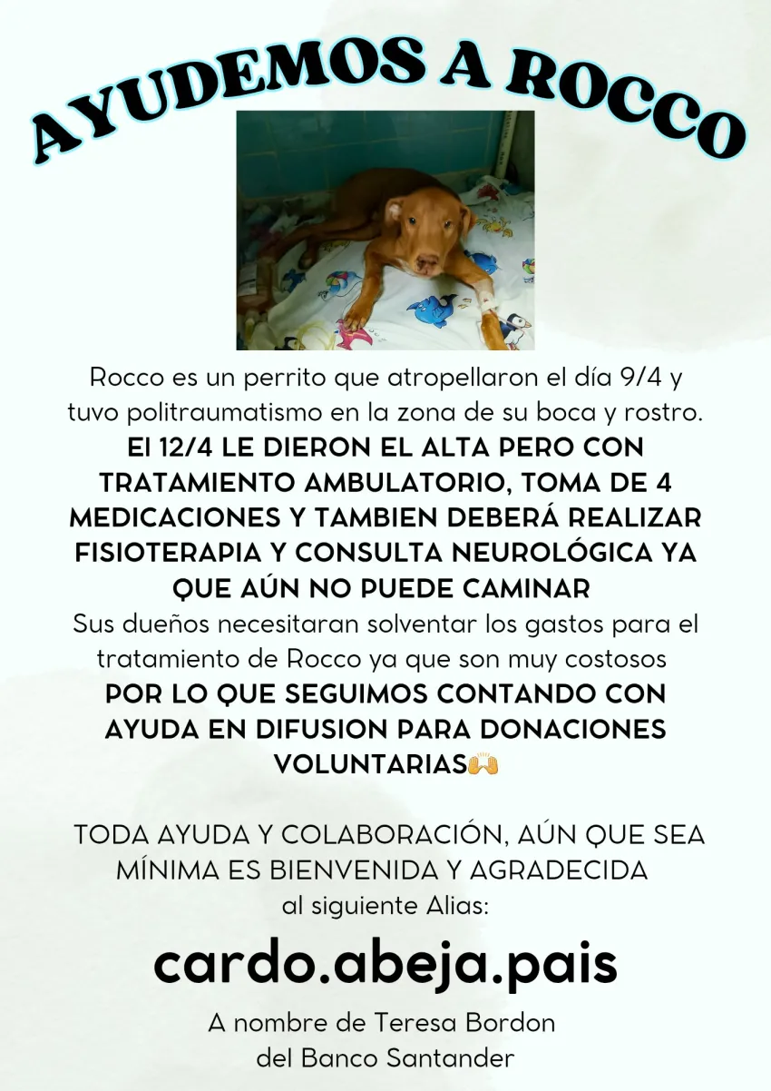 "Sabemos que su recuperación será lenta, pero con amor, cuidados y la colaboración de todos, Rocco tiene chances de salir adelante", expresaron desde su entorno. Por eso, su familia sigue apelando a la solidaridad de la gente para difundir su historia y aportar, incluso con lo mínimo, a través del alias: cardo.abeja.pais (a nombre de Teresa Bordon, Banco Santander).