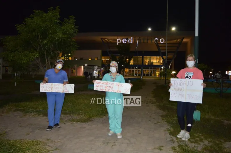 Tras varios minutos y dificultades en el tránsito, el personal de salud logró encontrarse frente al Hospital Pediátrico. Allí, las banderas argentinas, los carteles y las demandas se hicieron sentir.