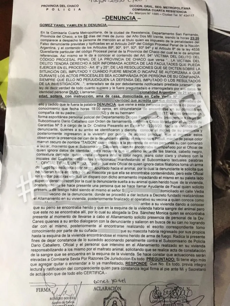 Luego de la orden, un oficial apuntó con la escopeta al animal por lo que la denunciante agarró a su mascota y solicitó "que no le hiciera nada ya que ella se encontraba conteniéndolo, pero sin mediar palabras efectuó un disparo que impactó en su paleta lado superior derecho, razón por la cual suelta al animal que huye de la vivienda", consta en la denuncia.