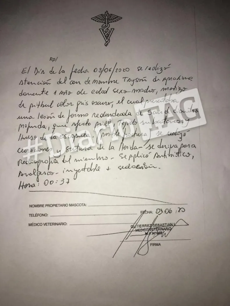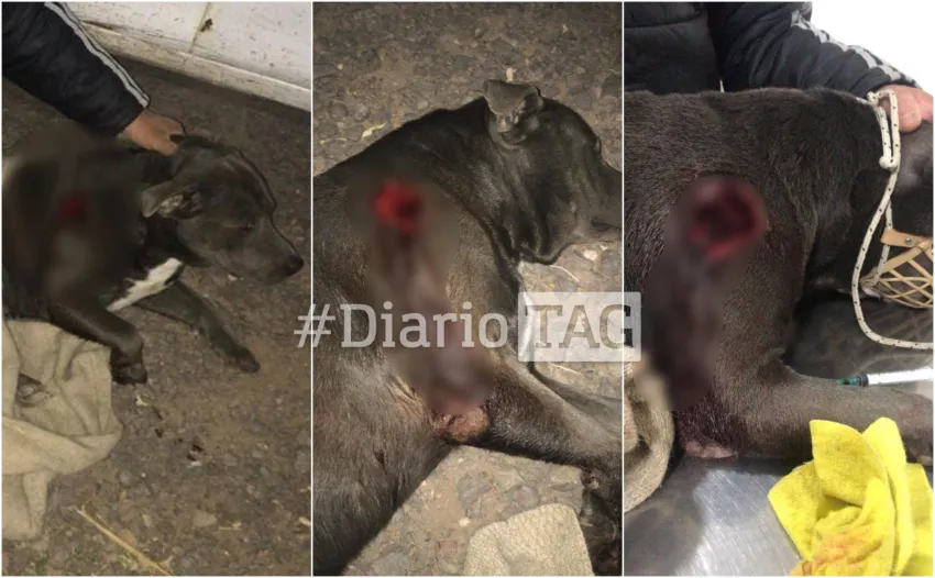 "Tayson de aproximadamente un año de edad, mestizo de pitbull presentaba una lesión de forma redondeada de 5 centímetros de diámetro que afectó piel, tejido subcutáneo y hueso con posible fractura", fue el diagnostico del médico veterinario que lo atendió.
