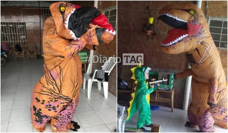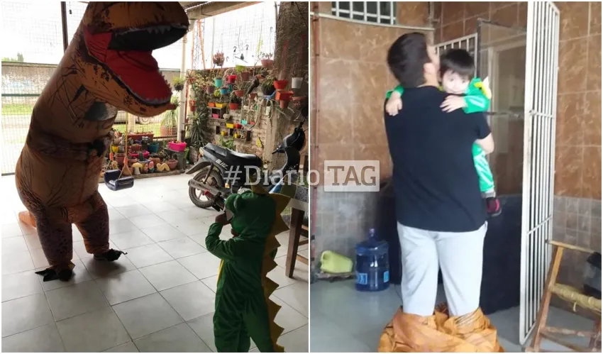 Finalmente el día del rencuentro llegó y para hacerlo aún más especial, luego de más de 90 días lejos de su hijo, decidió sorprenderlo disfrazado de dinosaurio, el animal favorito de Rodrigo quien no pudo ocultar la felicidad del tan ansiado rencuentro con su padre.