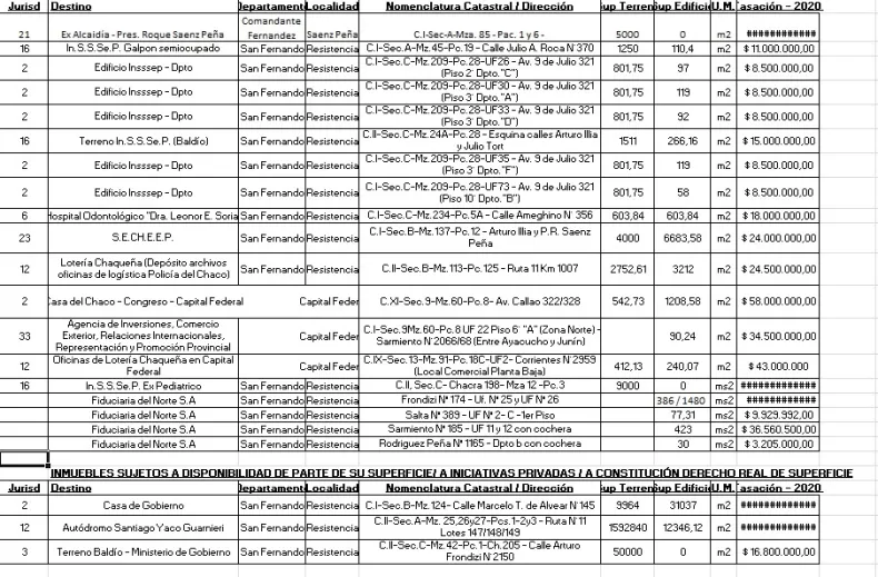 Esos bienes, fueron mencionados en el "anexo 1" presentado en el proyecto. Así se menciona a edificios como la Casa de Gobierno, la Casa del Chaco en Buenos Aires, el Ex Pediátrico, el Autódromo Santiago Yaco Guarnieri, entre otros.