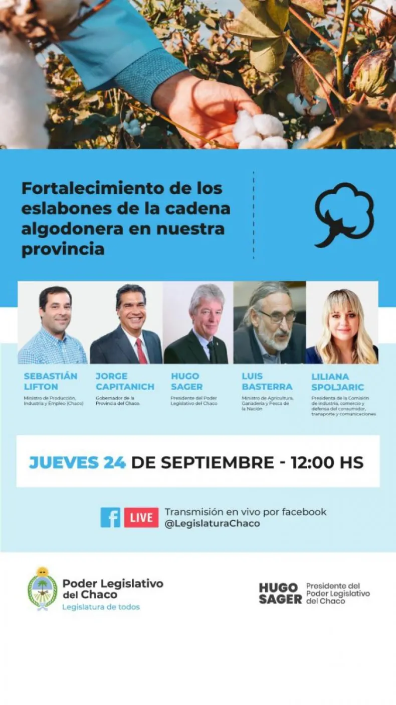El presidente del Poder Legislativo, Hugo Sager, y la titular de la Comisión de industria, comercio y defensa del consumidor, transporte y comunicaciones del Parlamento, la diputada Liliana Spoljaric, invitan a participar el jueves 24 de septiembre a las 12 del encuentro virtual "Fortalecimiento de los eslabones de la cadena algodonera en nuestra provincia".