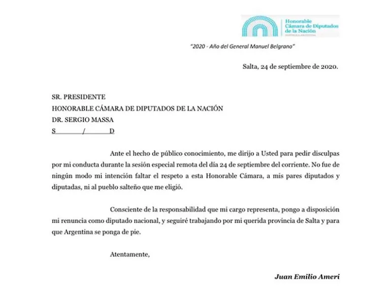 "Ante el hecho de público conocimiento me dirijo a usted para pedir disculpas por mi conducta durante la sesión especial remota del día 24 de septiembre del corriente. No fue de ningún modo mi intención faltar el respeto a esta Honorable Cámara, a mis pares diputados y diputadas, ni al pueblo salteño que me eligió", expresó Ameri en la carta de renuncia que presentó al titular del cuerpo legislativo.