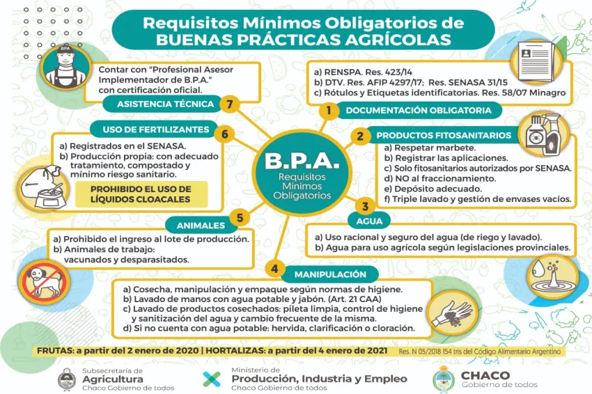Las prácticas incluyen: manejo responsable de fitosanitarios; uso racional y segura del agua; cosecha y manipulación de las frutas y hortalizas; prohibición de ingreso de animales domésticos en el lote; sanidad y buena alimentación de animales de trabajo; uso de fertilizantes orgánicos y enmiendas; asistencia técnica idónea y documentación obligatoria para la trazabilidad (Registro Nacional Sanitario de Productores Agropecuarios (Renspa), Documento de Tránsito Vegetal (DTV), rótulos y etiquetas).