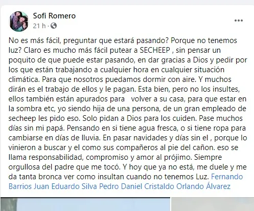 Pese a que muchas veces los reclamos son hacia la empresa, la hija de un operario cuestionó que se critique a los trabajadores. "¿No es más fácil preguntar que estará pasando? ¿Por qué no tenemos luz? Claro es mucho más fácil putear a SECHEEP sin pensar un poquito de que puede estar pasando, en dar gracias a Dios y pedir por los que están trabajando a cualquier hora en cualquier situación climática", cuestionó.