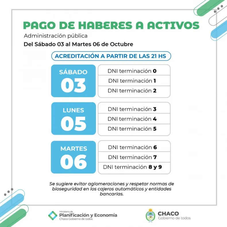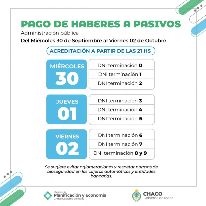 El Ministerio de Planificación y Economía informó que a partir de este miércoles 30 de septiembre inicia el cronograma de pagos de salarios a pasivos de la Administración Pública Provincial, mientras que los trabajadores activos comenzarán a cobrar desde el sábado 3 de octubre.