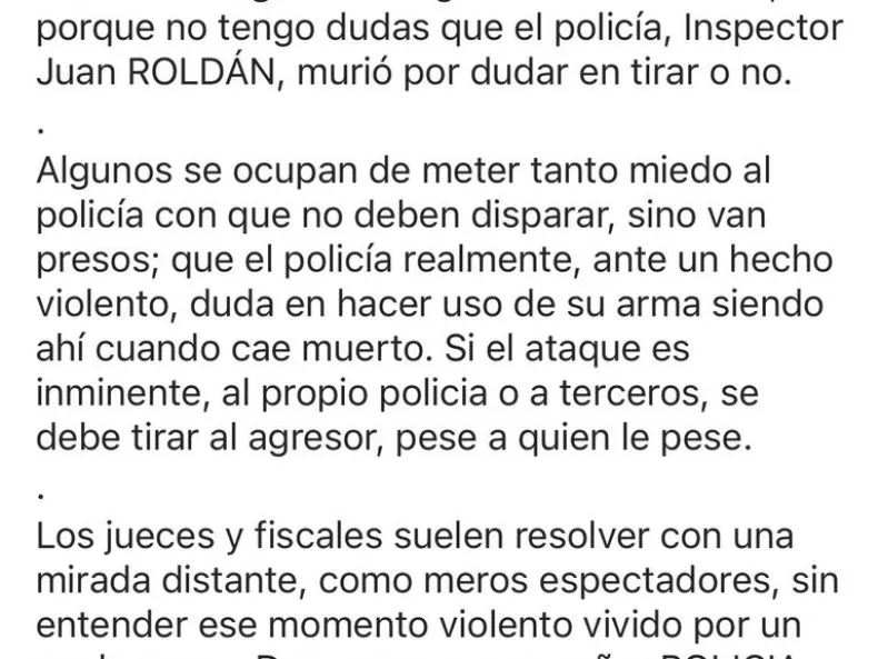 "Los jueces y fiscales suelen resolver con una mirada distante, como meros espectadores, sin entender ese momento violento vivido por un ser humano", agregó. La publicación estuvo acompañada de dos fotos de Roldán a modo de homenaje: "Descansa en paz señor policía".