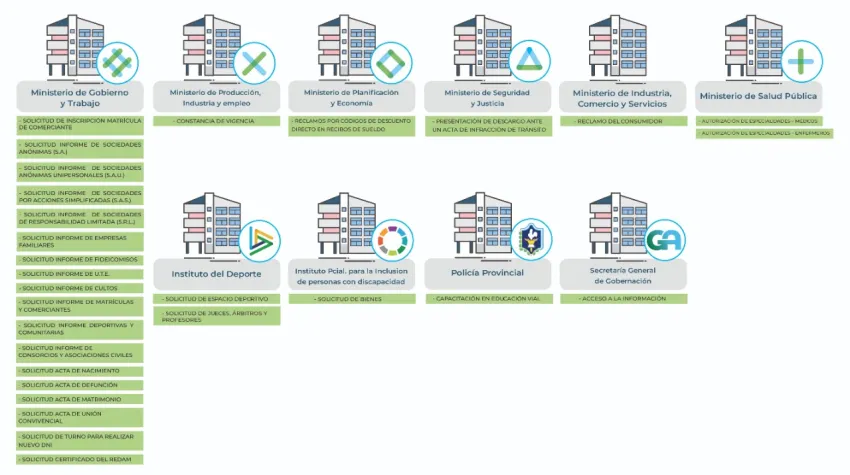 Ministerio de Gobierno y Trabajo:Solicitud de Inscripción Matrícula de ComercianteSolicitud Informe de Sociedades Anónimas S.ASolicitud Informe de Sociedades Anónimas Unipersonales (S.A.U)Solicitud Informe de Sociedades por Acciones Simplificadas (S.A.S)Solicitud Informe de Sociedades de Responsabilidad Limitada (S.R.L)Solicitud Informe de Empresas FamiliaresSolicitud Informe de FideicomisosSolicitud Informe de U.T.ESolicitud Informe de CultosSolicitud Informe de Matrículas y ComerciantesSolicitud Informe Deportivas y ComunitariasSolicitud Informe de Consorcios y Asociaciones CivilesSolicitud Acta de NacimientoSolicitud Acta de DefunciónSolicitud Acta de MatrimonioSolicitud Acta de Unión ConvivenciaSolicitud de Turno para realizar D.N.I