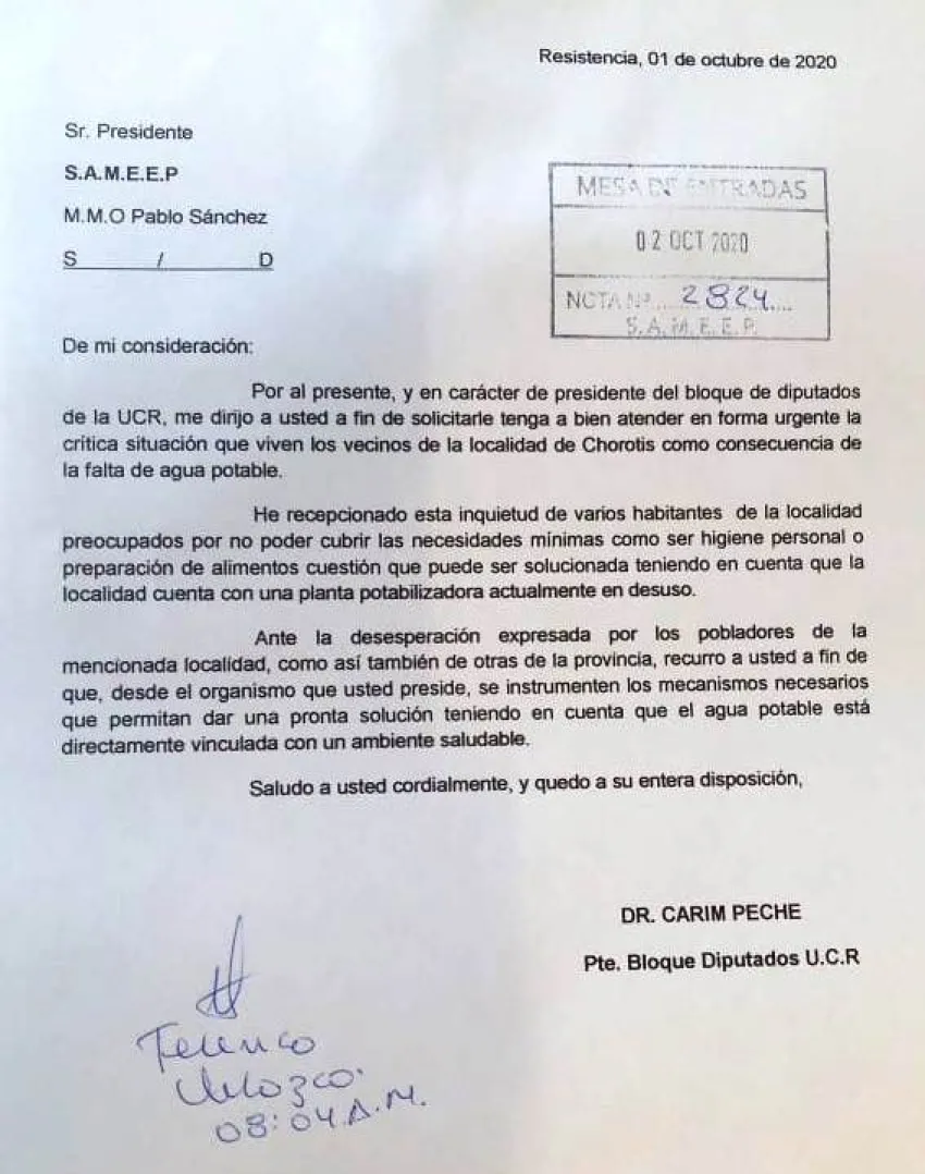 En ese contexto, el presidente del bloque de diputados radicales, Carim Peche adelantó que hizo llegar una carta personal al presidente de SAMEEP, Pablo Sánchez, solicitando una pronta intervención: "Estamos muy preocupados por la crítica situación que se vive por la sequía y por los incendios, presentamos en la Legislatura un proyecto de Ley para que se declare la emergencia provincial y nacional; y en ese mismo sentido hice llegar una nota a las autoridades de SAMEEP a fin de que se atienda la necesidad de agua potable en Chorotis y en cada una de las localidades en las que falta o es insuficiente el suministro de agua potable", finalizó.