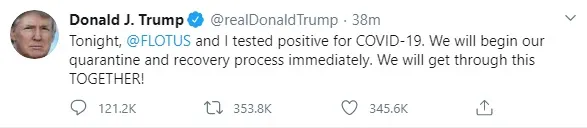 "Esta noche la Primera dama y yo dimos positivo de covid-19. Empezaremos inmediatamente nuestra proceso de cuarentena y de recuperación. ¡Superaremos esto JUNTOS!", escribió el mandatario en Twitter.