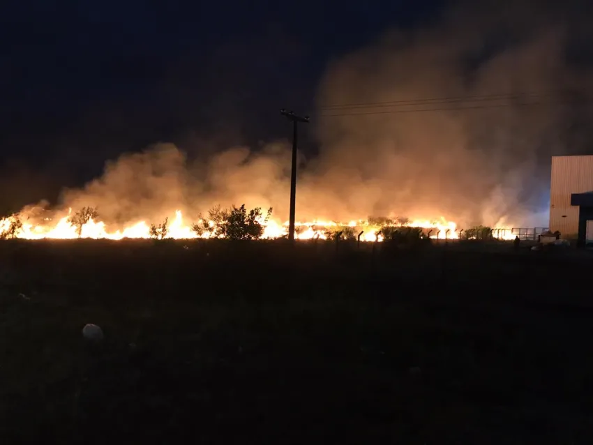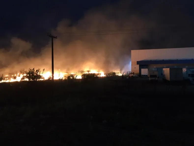 En los videos se puede observar como al costado de la mencionada fábrica un voraz incendio de pastizales amenaza con llegar hasta las instalaciones.