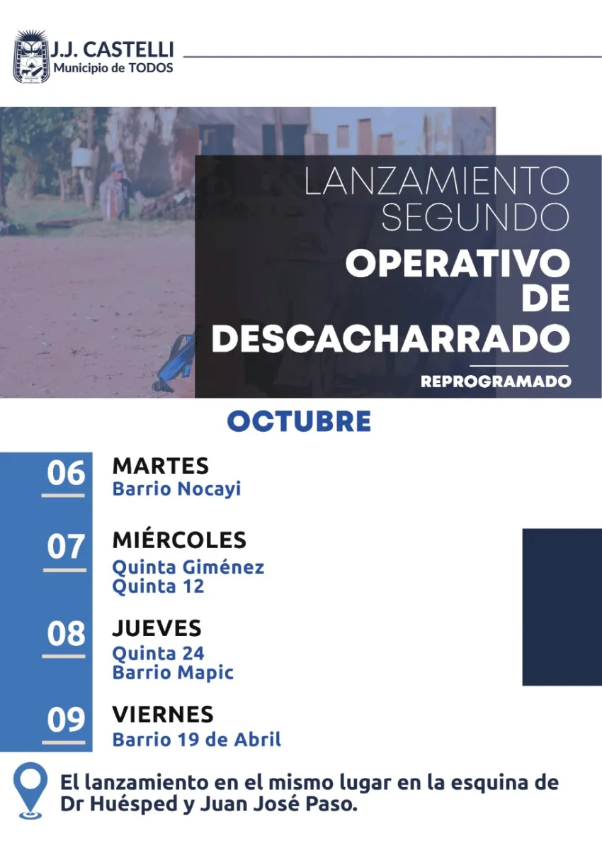 Debido al asueto del lunes 5 por el 84° aniversario de la ciudad, la Municipalidad de Juan José Castelli reprogramó el lanzamiento de los operativos de descacharrado, lucha y prevención de dengue, zika y chikungunya para el martes 6 a las 8 hs.