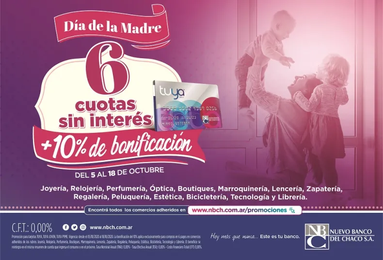 Esta promoción de Tuya, marca propia de Nuevo Banco del Chaco, estará habilitada en comercios de toda la provincia de los rubros joyería, relojería, perfumería, boutiques, marroquinería, lencería, zapatería, regalaría, peluquería, estética, bicicletería, tecnología y librería.