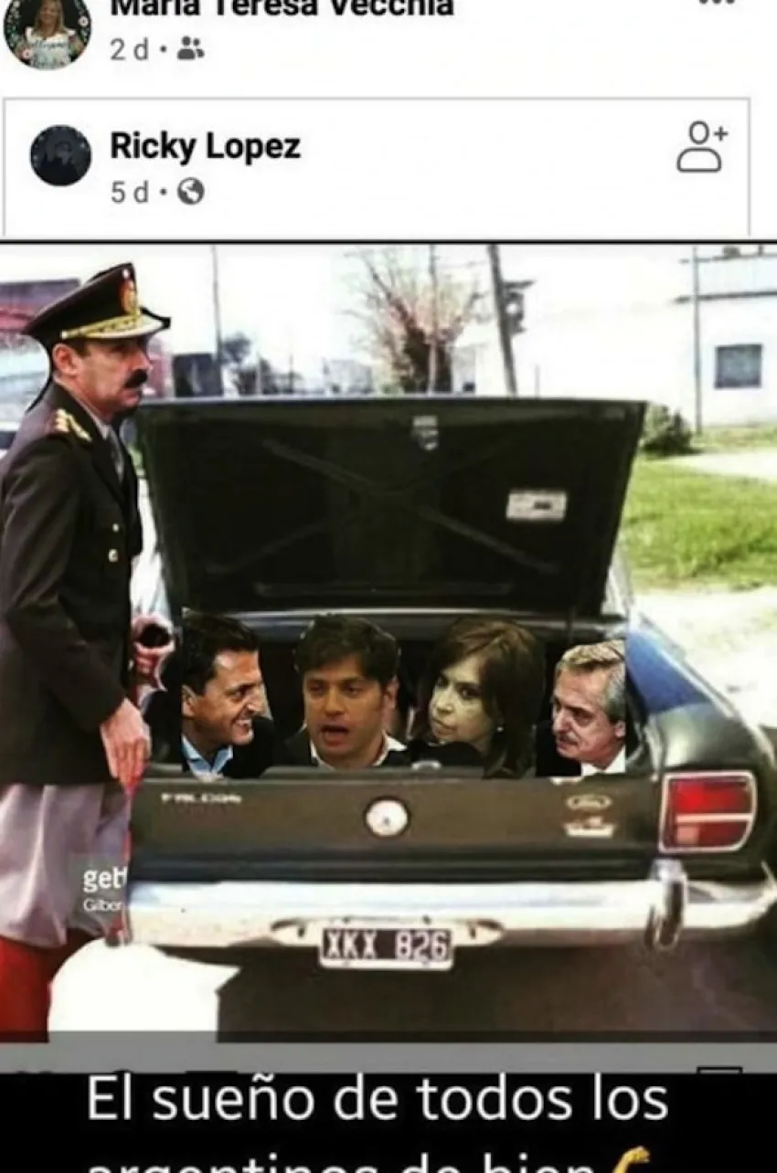 La directora de una escuela de la localidad santafesina de Villa Gobernador Gálvez quedó en medio de un escándalo después de que publicara en su perfil de Facebook una imagen sobre el terrorismo de Estado. "El sueño de todos los argentinos de bien", decía al pie la foto en la que podía observarse al genocida Jorge Rafael Videla junto a un Falcon verde, del cual asomaban las cabezas de sus víctimas: Alberto Fernández, Cristina Kirchner, Sergio Massa y Axel Kicillok.
