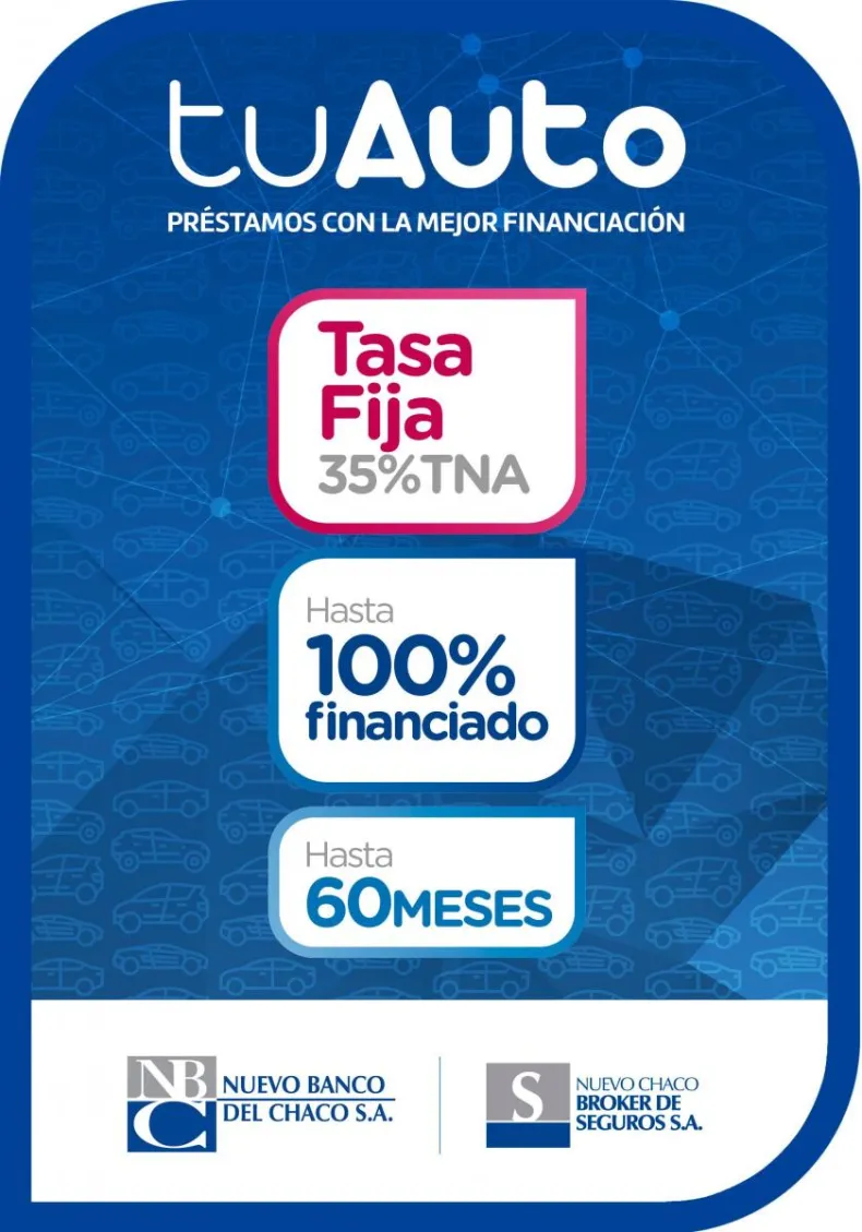 La línea de préstamos personales Tu Auto de Nuevo Banco del Chaco permite financiar vehículos usados con las mismas condiciones que para un 0 kilómetro: tasa de interés fija 35% anual, plazo de hasta 60 meses y hasta el 100% del valor de la unidad, en concesionarias adheridas de toda la provincia.