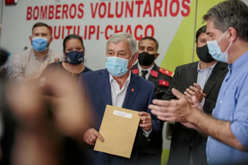 El gobernador Jorge Capitanich, entregó, este martes por la tarde, diez nuevos trajes a los Bomberos Voluntarios de Quitilipi. El equipamiento, financiado por el Ministerio de Seguridad y Justicia de la provincia, requirió una inversión de $800.000. Además, habilitó tres cuadras de pavimento urbano financiadas por la Dirección de Vialidad Provincial y anunció que en los próximos meses iniciarán las obras para la construcción de 34 nuevas cuadras para la localidad, financiadas por el Banco Interamericano de Desarrollo (BID).
