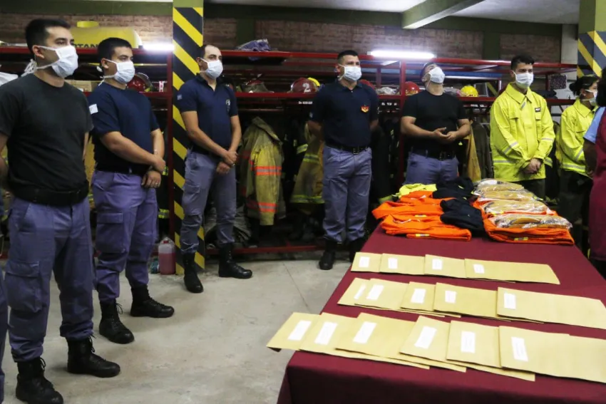 Los trajes para y mochilas entregados a los Bomberos Voluntarios conformaban diez kits que incluían: pantalón y camisas forestales, con refractivos incorporados y tratamiento ignífugo - resistentes a cortes, abrasión y altas temperaturas -.