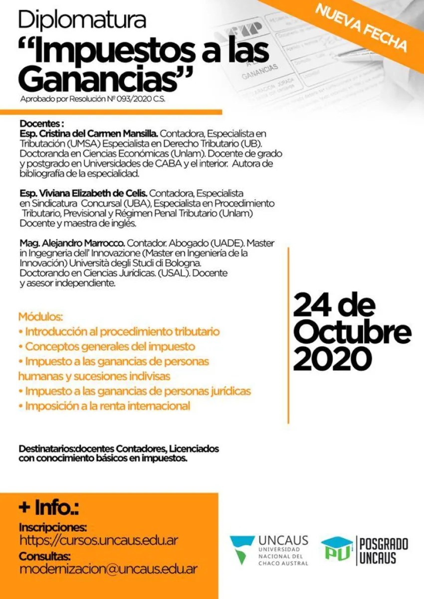 La Universidad Nacional del Chaco Austral, a través del área de Secretaría Académica- Área de Posgrado, abrió inscripciones para la Diplomatura a distancia de "Impuestos a las Ganancias", que comenzará el próximo 24 de octubre y tendrá una duración de 5 meses.