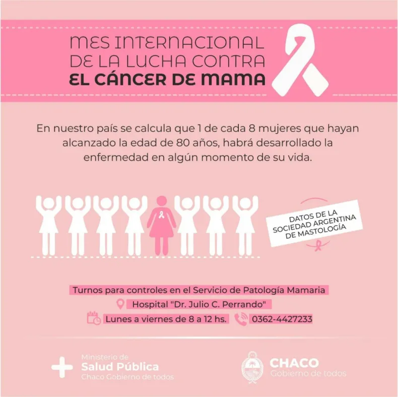 El Ministerio de Salud Pública del Chaco, siguiendo la propuesta a nivel global de la Organización Mundial de la Salud (OMS), conmemora a lo largo de octubre el mes de la concientización sobre el cáncer de mama, el tumor maligno más frecuente en la mujer. Según estimaciones de la Sociedad Argentina de Mastología en nuestro país se calcula que 1 de cada 8 mujeres que hayan alcanzado la edad de 80 años habrá desarrollado la enfermedad en algún momento de su vida y se detectan entre 15.000 a 20.000 nuevos casos por año.