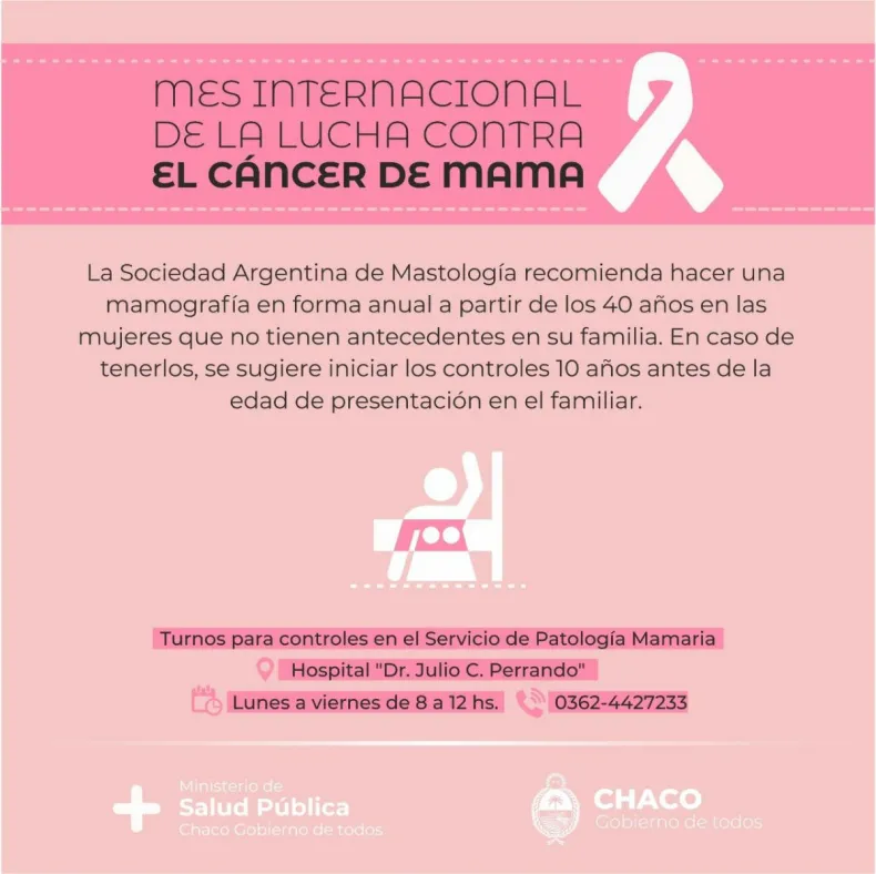 Entre las actividades programadas para este "Octubre Rosa", mes de concientización sobre el cáncer de mama, el Servicio de Patología Mamaría del Hospital Julio C. Perrando brindará una serie de charlas virtuales. La primera de ella se realizó en coordinación con el Servicio de Preparación Integral de la Maternidad (PIM). Por otra parte, el Consultorio Radiológico Resistencia, ubicado en Avenida 9 de Julio 635, realizará mamografías para pacientes sin obra social durante todo el mes.
