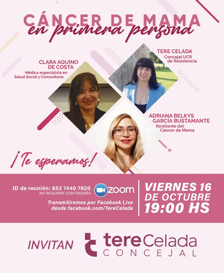 La Concejal María Teresa Celada, invita a participar de la charla "Cáncer de mama en primera persona", que tendrá como objetivo concientizar acerca de esta enfermedad que afecta a miles de mujeres, al respecto comentó: "Comenzamos octubre con una consigna fundamental para la comunidad, cuidar y prevenir. Es que el 19 de octubre se conmemora a nivel mundial, el día de la lucha contra el cáncer de mama".