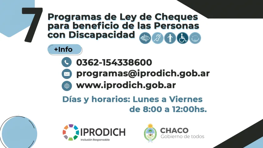 El Instituto Provincial para la Inclusión de las Personas con Discapacidad del Chaco (IPRODICH) recuerda que hasta el 31 de octubre de este año se puede acceder a los siete Programas de "Ley de Cheques". Personas con discapacidad, municipios, cooperativas, organizaciones gubernamentales y ONG’s podrán acceder a los distintos proyectos que se tramitan y financian por la Agencia Nacional de Discapacidad a través del Fondo Nacional para la integración de Personas con Discapacidad encarado por un Comité Coordinador.