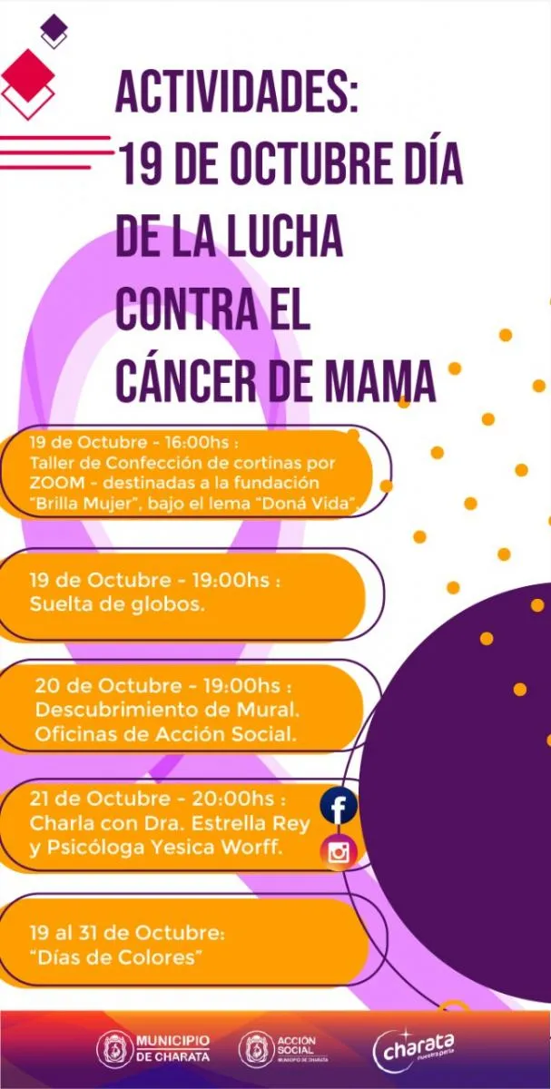 El día 20 la propuesta será el descubrimiento de un mural; el 21 a las 20 por redes sociales de Municipio y acción social se brindará una charla a cargo de la doctora Estrella Rey y la licenciada Yesica Worff, sobre este importante tema. Desde el 19 en adelante también se hará una actividad denominada Días de Colores que servirá para recaudar fondos que serán destinados a Alcec.