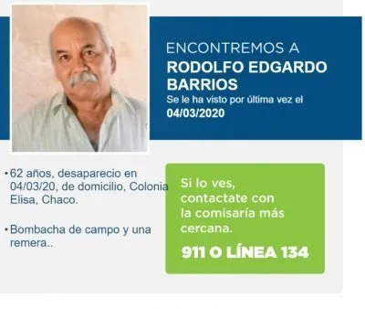 Edgardo Barrios de 62 años se encuentra desaparecido desde el pasado 4 de marzo y es buscado luego de una denuncia radicada en la Comisaría de Colonia Elisa.