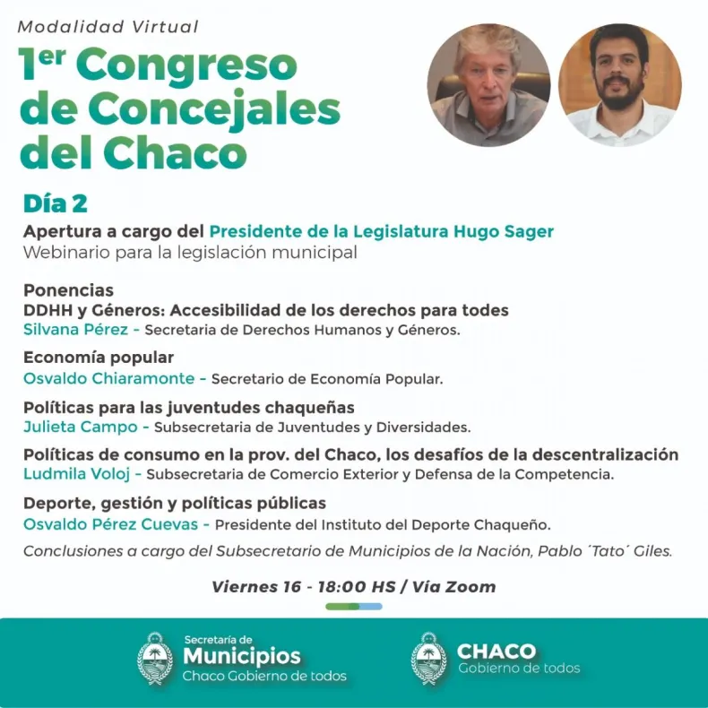Para el segundo día del evento está previsto que se lleve adelante el Panel Webinario para la Legislación Municipal. A cargo de su apertura estará el diputado Hugo Sager y contará con el acompañamiento de destacados referentes políticos.