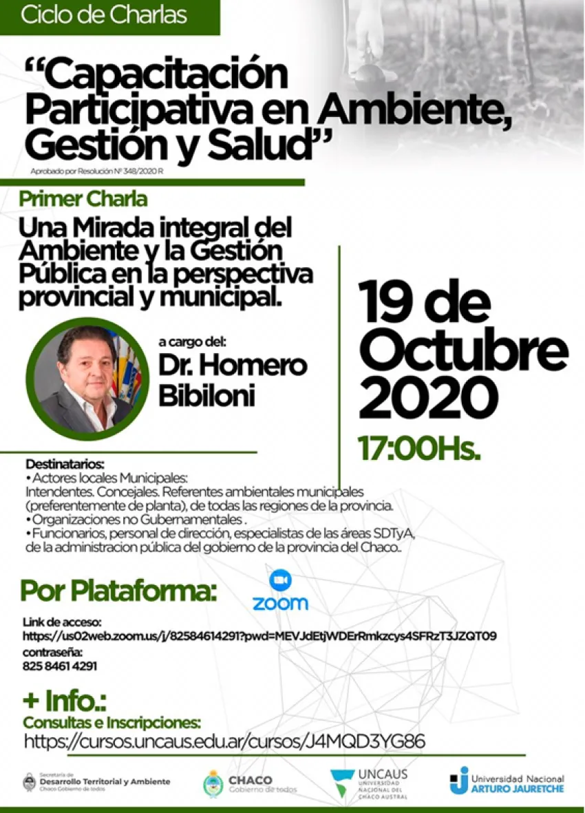 Con la presencia del primer disertante, Homero Bibiloni; la secretaria de Desarrollo Territorial y Ambiente Marta Soneira; el rector de la Universidad Nacional Arturo Jauretche Ernesto Fernando Villanueva; el secretario de Municipios del Chaco, Cristian Ocampo; y diversos intendentes de municipios de la Provincia del Chaco se dio inicio a este ciclo de charlas orientado a dirigentes, autoridades, representantes y público en general interesado en la materia ambiental y su atención.