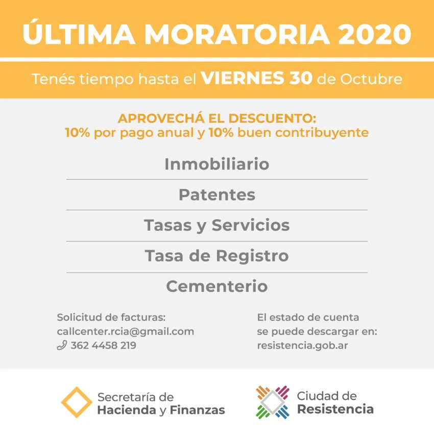 El Municipio de Resistencia recuerda que se encuentra vigente hasta el viernes 30 de octubre la última prórroga para el pago de todos los tributos municipales correspondientes al 2020. Facilidad de pago que ofrece al vecino el 10% de descuento por el pago anual y el 10 % de descuento por buen contribuyente, sumando en total un 20% de descuento si se paga todo el 2020.
