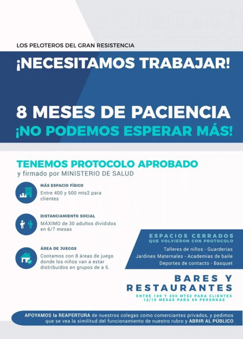 "Tenemos aprobado por el Ministerio de Salud, desde el 16 de octubre está firmado y aprobado. Nosotros el 1 de octubre tuvimos una reunión, una videoconferencia con el gobernador Capitanich y su secretaria en la que tanto a nosotros como a las guarderías, por el formato de funcionamiento con el que queremos volver, nos había dado el ok. Nos dijo que entre el lunes y el martes de la semana posterior, o sea, 5 o 6 de octubre, se firmaba el decreto con nuestra reapertura", señaló.