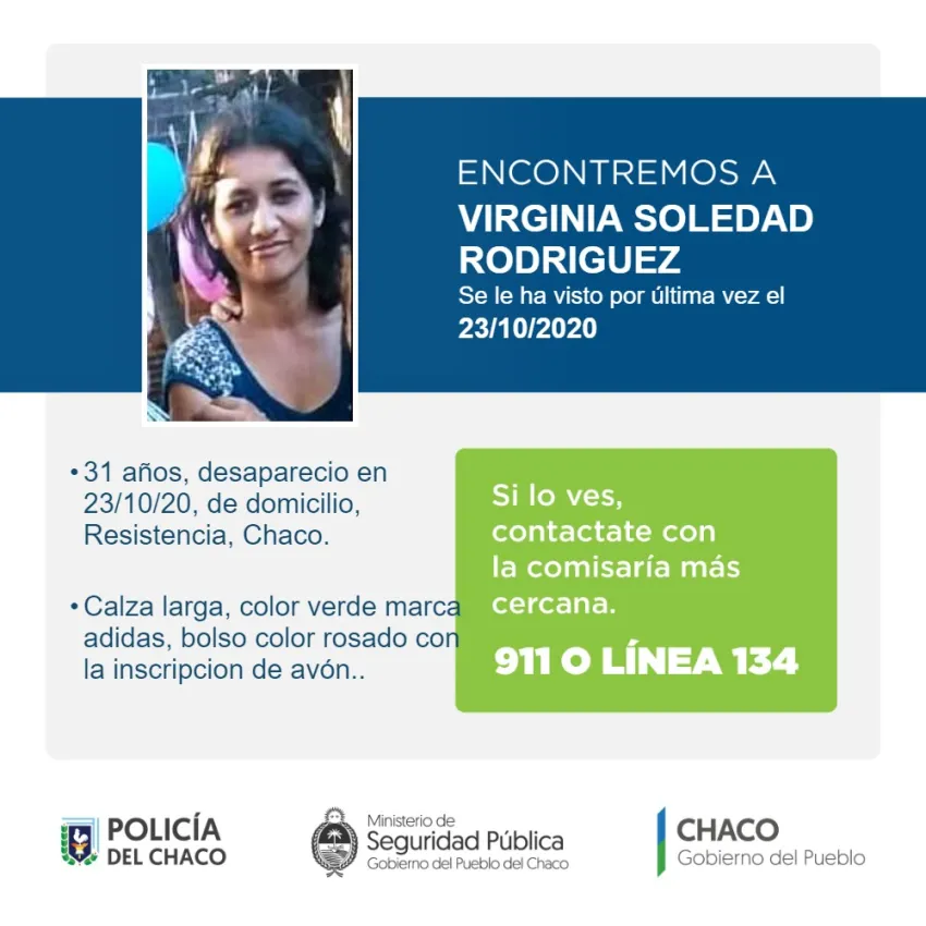 El viernes pasado se realizó una denuncia por la desaparición de Virginia Soledad Rodríguez de 31 años, quien desde ese día se encuentra desaparecida al ser vista por última vez en su domicilio.