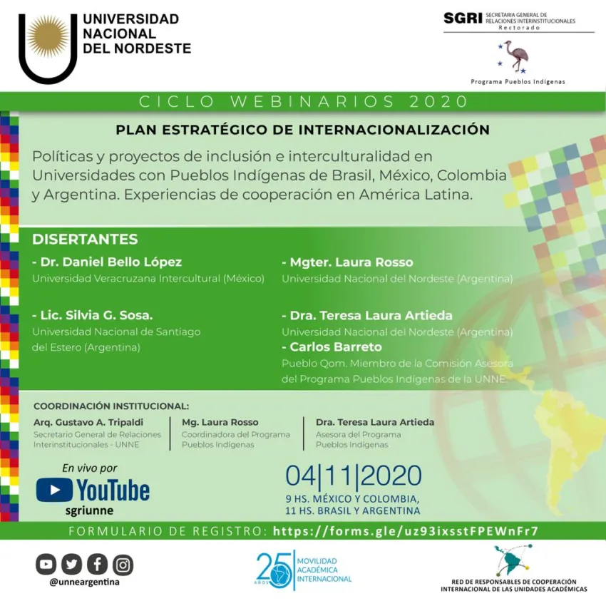 Experiencias de Cooperación en América Latina" que se enmarca en el Proyecto de Fortalecimiento de la Internacionalización de la Educación Superior promovido por la UNNE organizado por la Secretaría General de Relaciones Interinstitucionales (SGRI) junto al Programa Pueblos Indígenas (PPI) de la UNNE.
