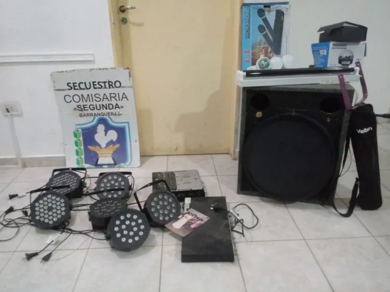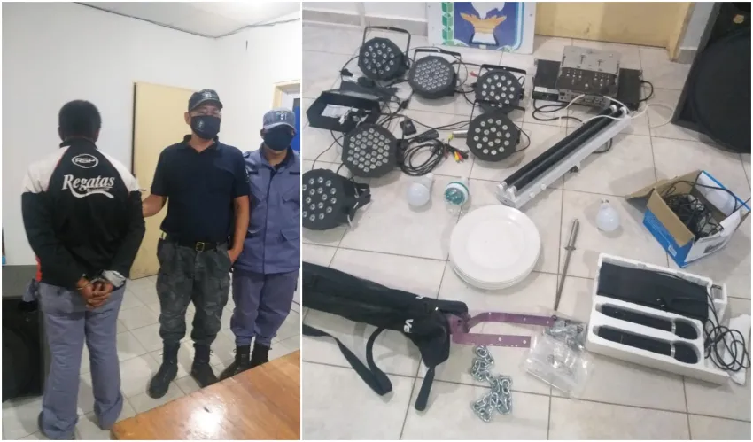 Momentos antes, el demorado había roto los candados de seguridad de un local comercial que funciona como salón de eventos "Isa. De allí se llevó seis luces de ambientación, una consola de música, micrófonos, accesorios de proyectores, parlantes y un ecualizador. Cabe destacar que el hombre se movilizaba en una moto de estado irregular.