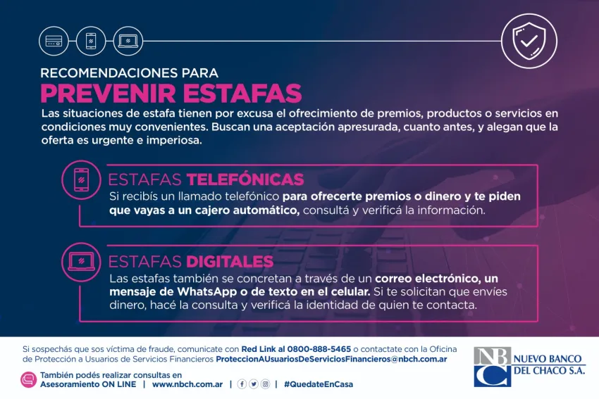 En caso de recibir una comunicación sospechosa, tomar los datos y hacer la denuncia en la dependencia policial más cercana. También se pueden reportar a Red Link al 0800-888-5465 con atención 24 horas y a Nuevo Banco del Chaco, a la Oficina de Protección a Usuarios de Servicios Financieros.