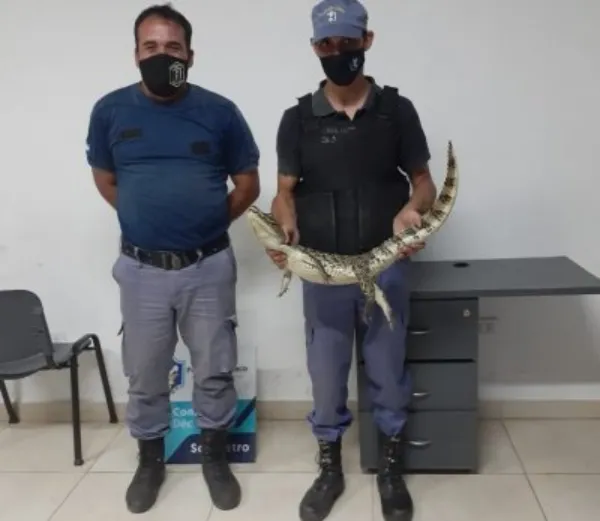 Anoche, en una casa de Pasaje Entre Ríos y calle 14, los integrantes de una familia se vieron sorprendidos al hallar un yacaré de tamaño pequeño. De inmediato dieron aviso a la Comisaria Decima, quienes atraparon al reptil y luego lo entregaron a la BOA para su cuidado.