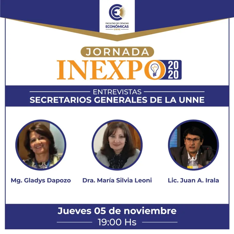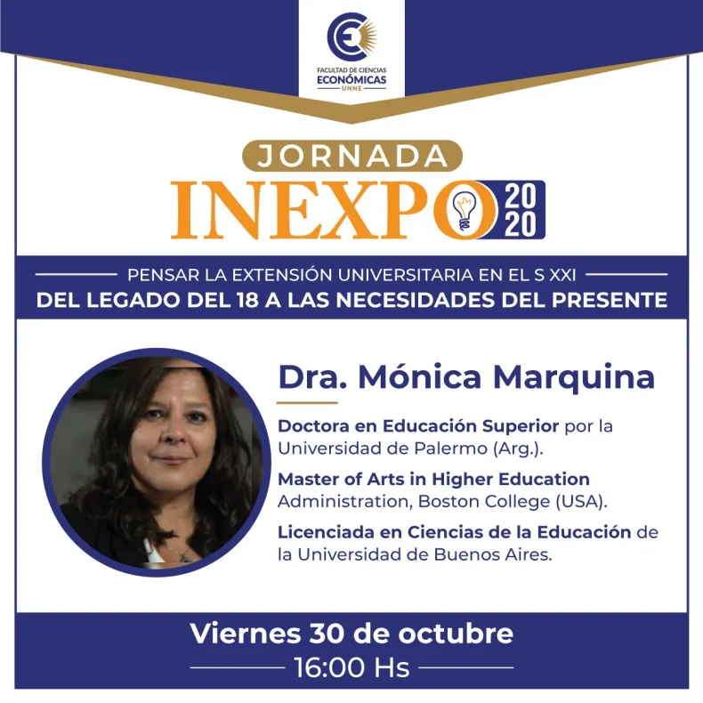 En el marco de las actividades que están siendo desarrolladas por la Facultad de Ciencias Económicas de la Universidad Nacional del Nordeste, este viernes 30 de octubre iniciarán las Jornadas INEXPO 2020 (Jornadas de Investigación, Extensión y Posgrado) con la conferencia de Mónica Marquina sobre "Pensar la extensiòn universitaria en el S.XXI. Del legado del 18 a las necesidades del presente".