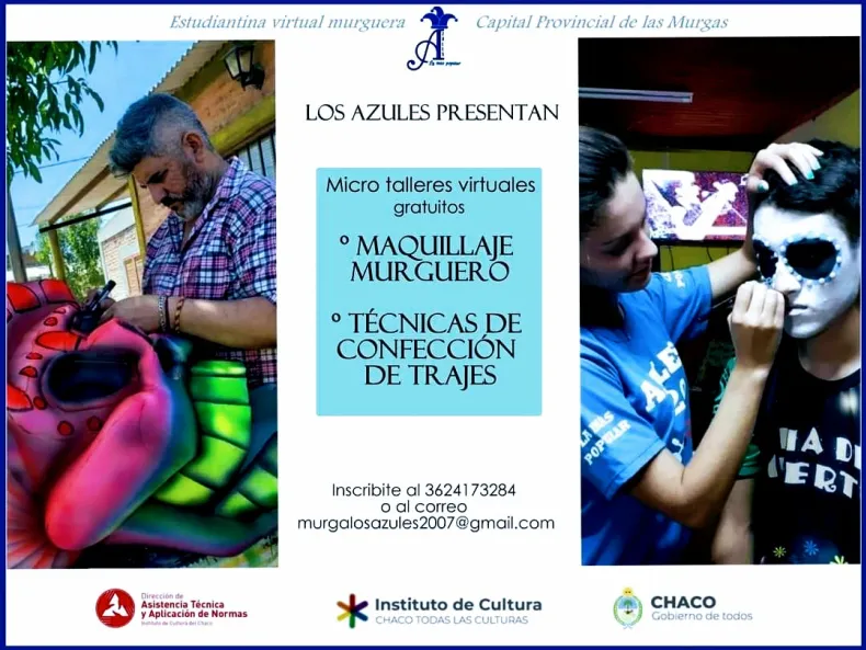 Este viernes 30 de octubre comenzará el Taller de Maquillaje y Diseño Murguero a cargo de Karen Rivero y Sergio García, integrantes de la Murga Los Azules de Puerto Tirol. El proyecto es financiado por el Instituto de Cultura a través del Fondo Solidario, Ley Nº1.353-E Fomento de la actividad privada en actividades culturales. Serán en formato video-tutorial, abiertos a todo público y se subirán al canal de YouTube y redes sociales de la Murga Los Azules.