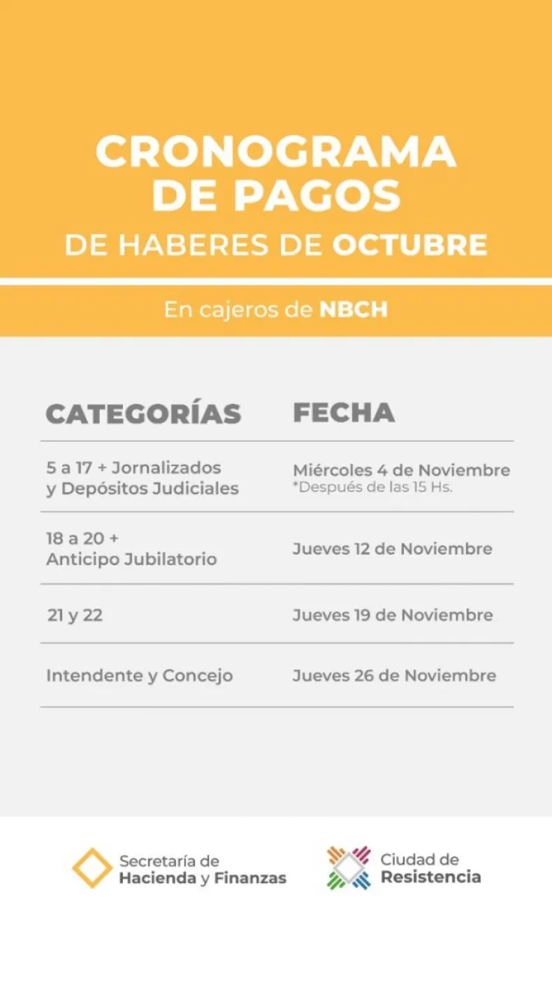 El Municipio de Resistencia, a través de la Secretaría de Hacienda y Finanzas, informó el cronograma de pagos de los haberes de octubre para empleados municipales.