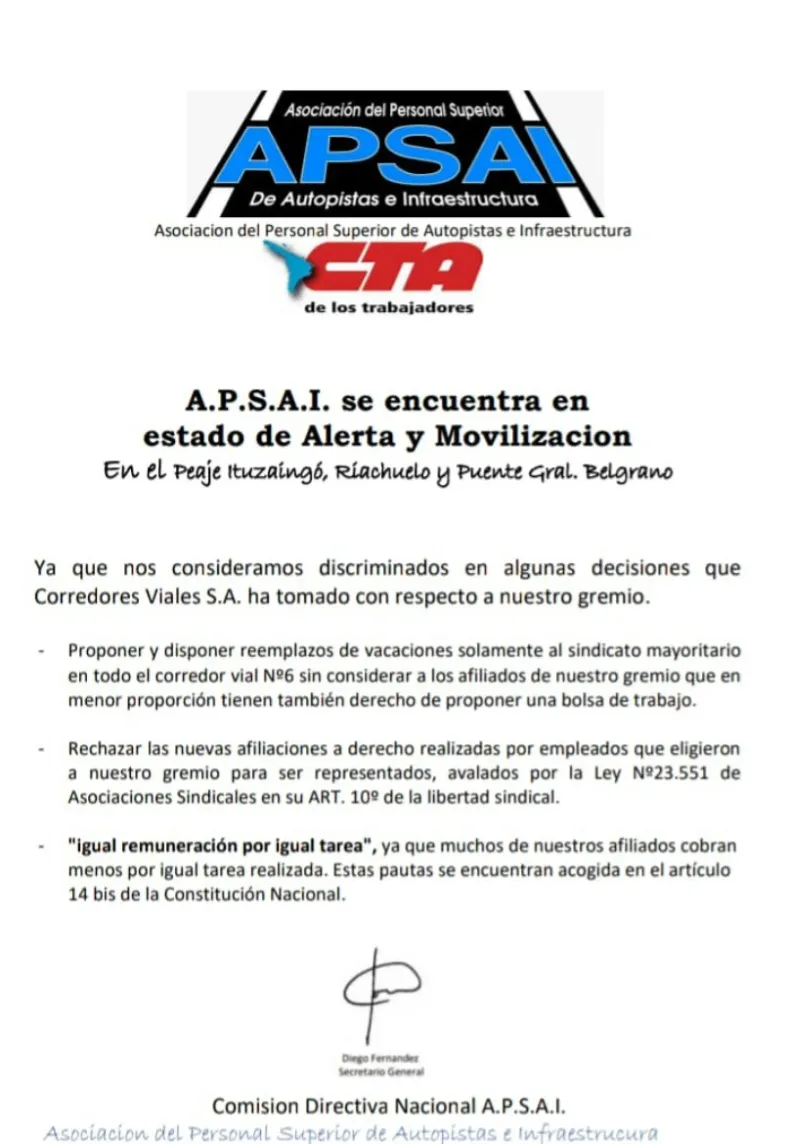Desde la a Asociación del Personal Superior de Autopistas e Infraestructura –APSAI-, sindicato nucleado en la CTA, justificaron la medida al sentirse "discriminados en algunas decisiones que Corredores Viales S.A. ha tomado con respecto a nuestro gremio".