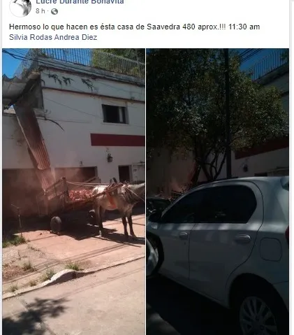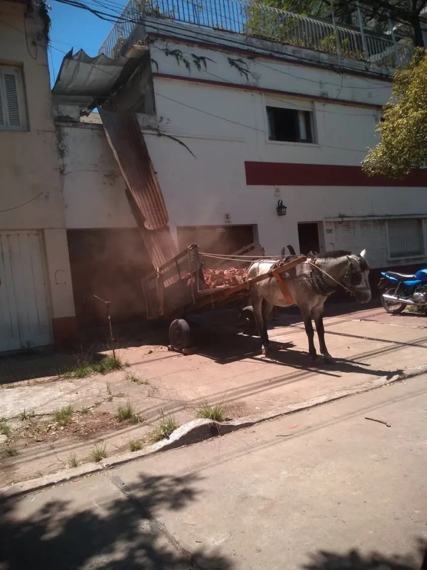 Lucre B. captó el momento exacto en el que, desde una rampa precaria montada con una chapa vieja, obreros arrojaban escombros desde una terraza a un carro amarrado a un caballo. "Hermoso lo que hacen es ésta casa de Saavedra 480 aprox.!!!", escribió en la publicación.