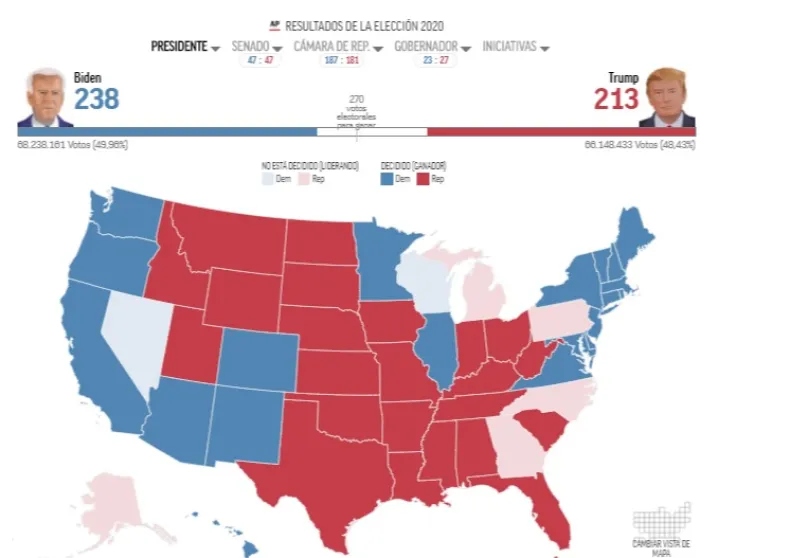 En la madrugada el republicano y el demócrata intercambiaban victorias en estados clave. Para alzarse con el triunfo se necesitan 270 escaños del Colegio Electoral. Trump ganó Florida y Biden hizo lo propio en Arizona.