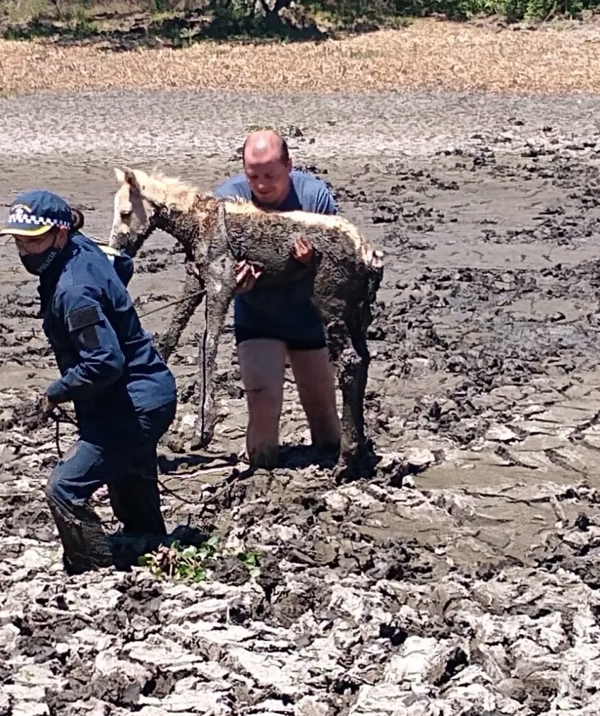 Alrededor de las 13:45 de este martes, varios llamados alertaron a la Policía sobre a un pequeño potrillo que estaba atrapado en el barro, en la parte seca del río Tragadero. El animal estaba atorado en un sector seco del cauce y lejos de la costa, al parecer había seguido a su mamá pero quedó atascado.