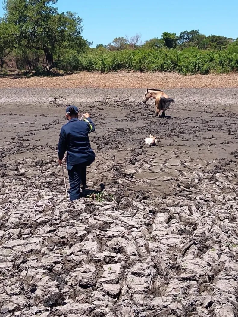 Los empleados policiales atravesaron los 50 metros del lodo hasta llegar al animal, lo rodearon con una soga, lo levantaron en brazos y lo llevaron hasta la orilla.