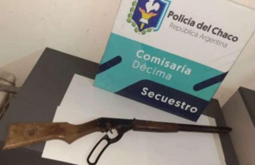 Cuando se dirigieron para controlar la situación, los violentos se dieron a la fuga dejando abandonada un rifle réplica similar Winchester, con caja de mecanismo, culata de madera y caños metálicos pintados en negro.