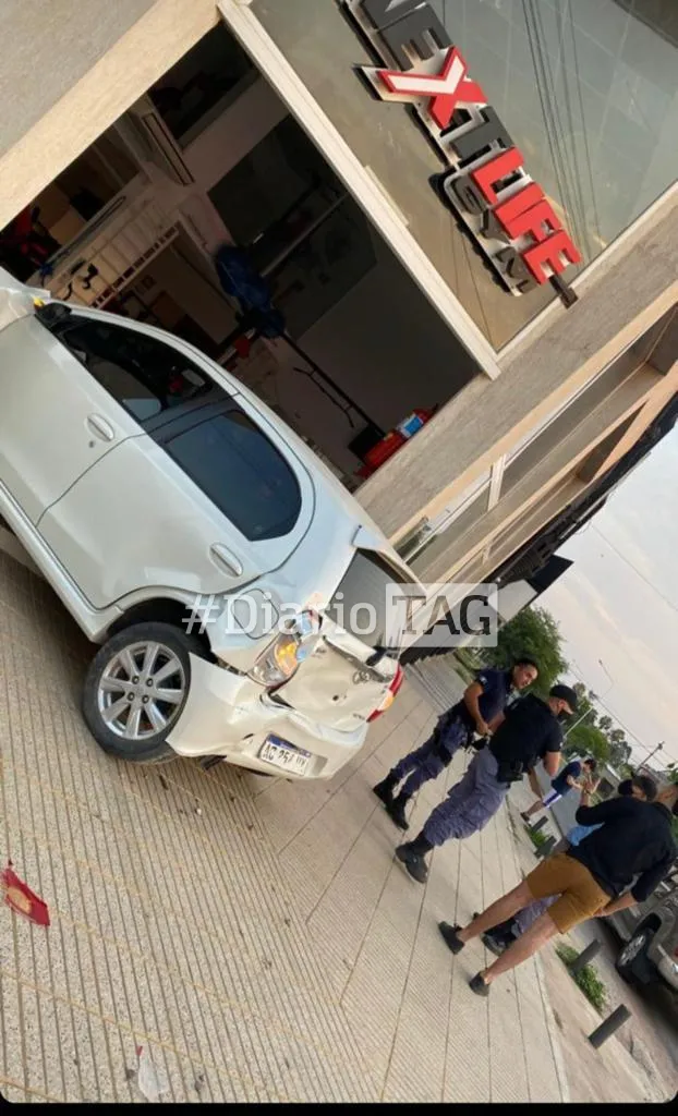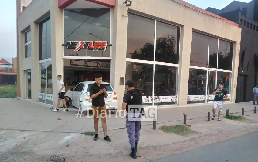 En calle 12 y 45 del barrio Puigbó de Sáenz Peña se registró esta madrugada un accidente de tránsito entre un automóvil Toyota Etios blanco que impactó en la puerta vidriada un gimnasio ubicado en ese lugar.