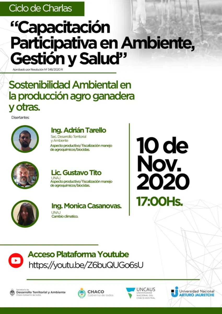 La charla virtual se realizará el día 10 de noviembre, a las 17 horas. La misma se realiza en el marco del Ciclo de Charlas: "Capacitación Participativa en Ambiente, Gestión y Salud", organizadas por la Universidad Nacional del Chaco Austral (UNCAus), junto a la Universidad Nacional de Arturo Jauretche (UNAJ) y la Secretaría de Desarrollo Territorial y Ambiente del Gobierno de la provincia de Chaco.