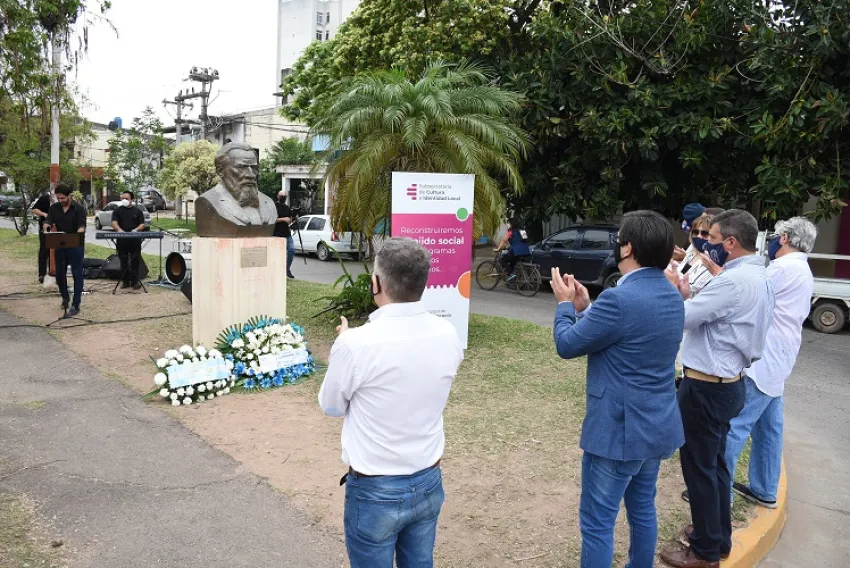 El intendente Gustavo Martínez encabezó el pequeño homenaje, que se realizó respetando los protocolos sanitarios exigidos, junto al subsecretario de Cultura comunal, Marcelo Tissembaum; el presidente de la Sociedad Rural, Marcelo Repetto; la vocal, María Mercedes Bogado y miembros de la Comisión Directiva de la entidad.